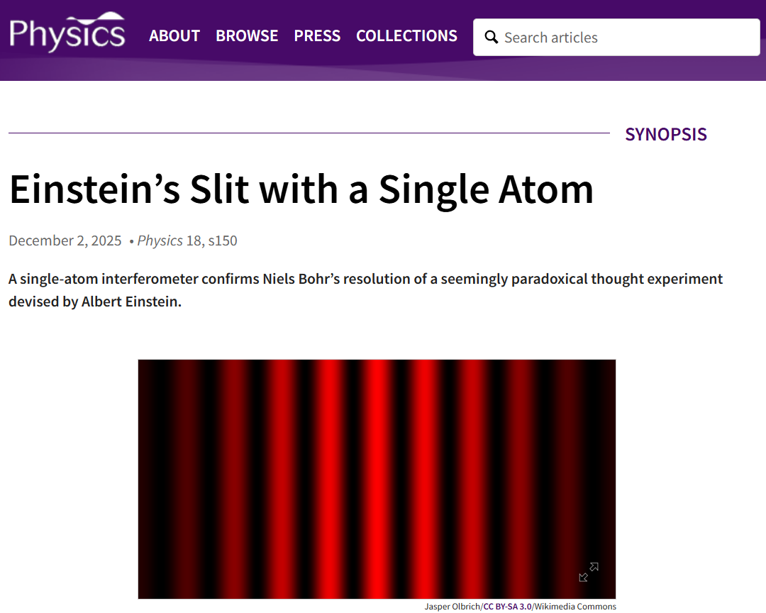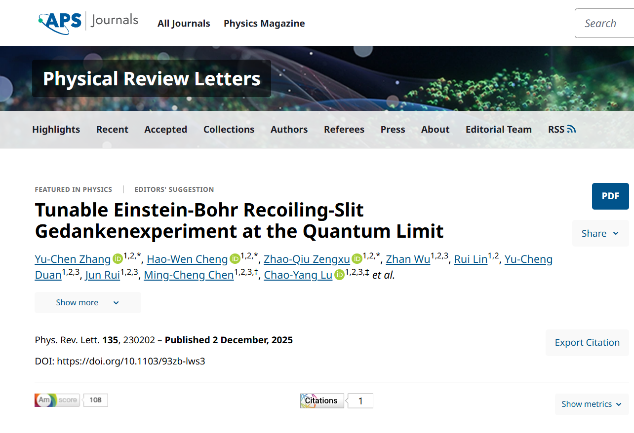 现在,九章团队利用光镊囚禁的量子基态单原子,首次忠实地实现了1927年爱因斯坦和玻尔争论中提出的“反冲狭缝”量子干涉思想实验,观测到了原子动量可调谐的干涉对比度渐进变化过程,证明了海森堡极限下的互补性原理,并展示了从量子到经典的连续转变过程。相关成果以编辑推荐的形式2025年12月3日发表于国际期刊《物理评论快报》。美国物理学会Physics栏目以“单原子的爱因斯坦狭缝”为题进行专题报道。
