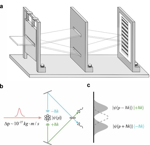 如图3a所示,本实验对传统的双缝装置(图1)进行了巧妙修改:中间的双缝固定,而左侧是一个“可移动狭缝”。当光子与此狭缝相互作用时,它可能向上或向下偏转,导致狭缝以相等且相反的动量反冲。爱因斯坦认为,通过准确测量狭缝的反冲可以确定光子的路径(粒子性),同时观察干涉条纹(波动性),这似乎与玻尔的互补性原理相冲突。