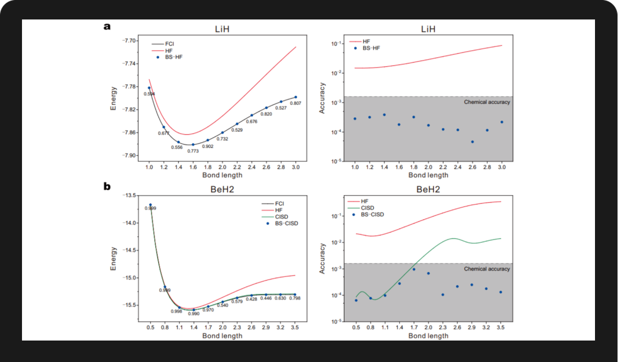 量子-经典混合算法在 LiH、BeH₂ 等分子的势能曲线上达到化学精度 (1.6×10⁻³ Hartree),展现超越经典方法的潜力。